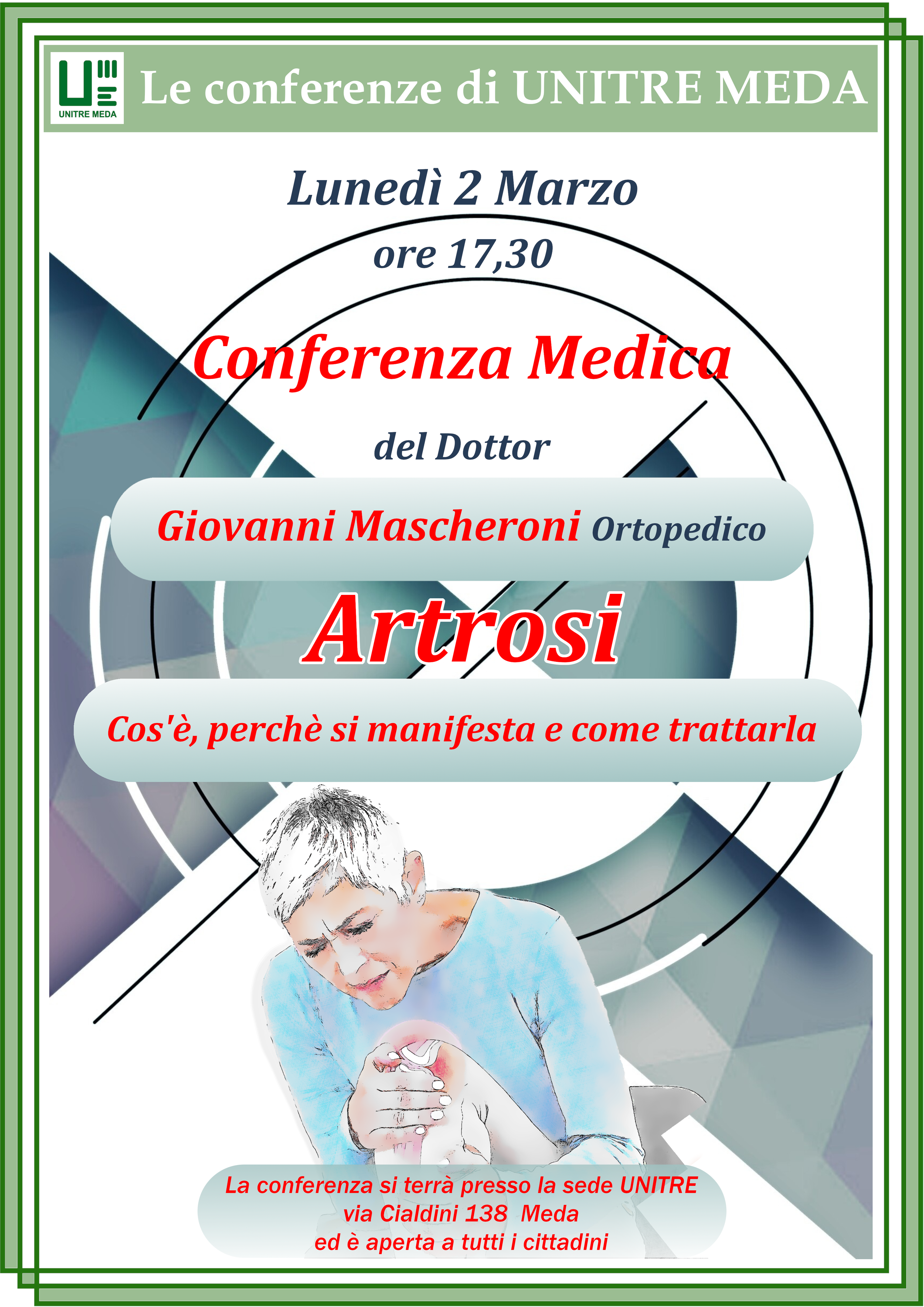 Continua la serie di conferenze mediche di UNITRE Meda con il quarto appuntamento dedicato all’artrosi. Cos’è? Come si manifesta? Come trattarla? Per non perdere queste importanti informazioni, vi aspettiamo numerosi.